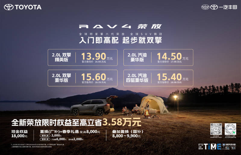 【太平洋汽车 汽车动态】近日,一汽丰田第六代全新荣放推出限时购车权益,叠加限时焕新价+国补+厂补至高省3.58万,综合下来,第六代全新荣放智能电混双擎精英版实际起步价为13.9万元。